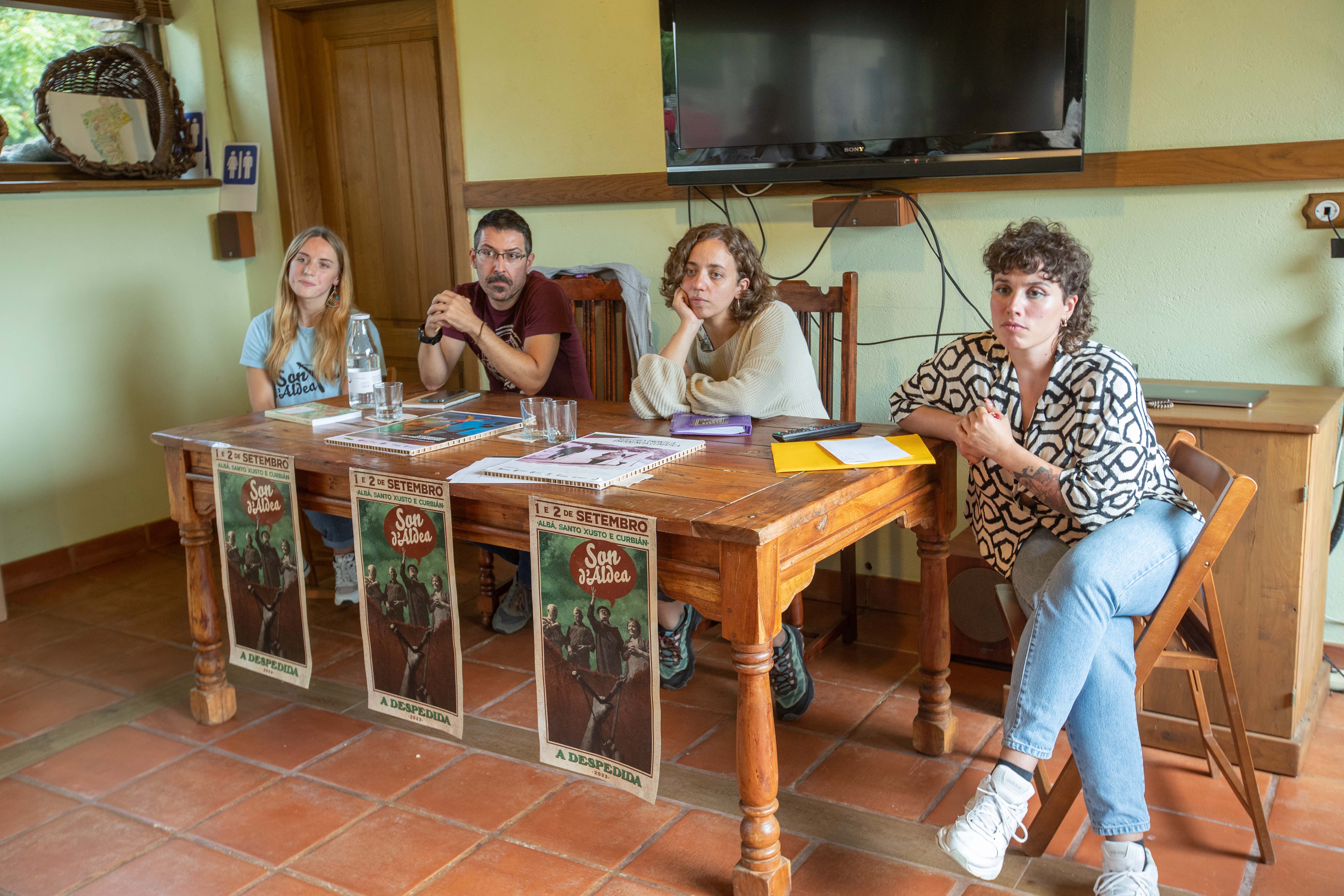 | SON D´ALDEA avivece de novo. Baixo a sombra das carballeiras, ao pé das casas de Curbián e a carón do río Roxán, percorremos as despedidas que axexan na aldea. Despedimos o rapaz e unha criada nena; lembramos a marcha á emigración; choramos unha cadela e unha vaca; a muller despide os queridos, o caseiro un lugar sen saber a onde ir; sentimos o baleiro de quen morre e as meigas axexan. Os nenos xogan a matar con escopetas de pau. Despedimos ao son vida. | |